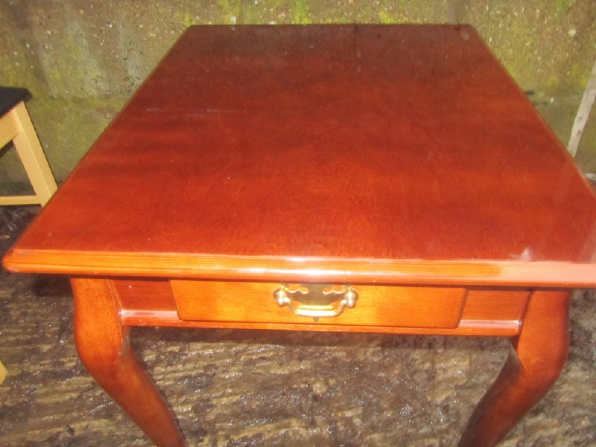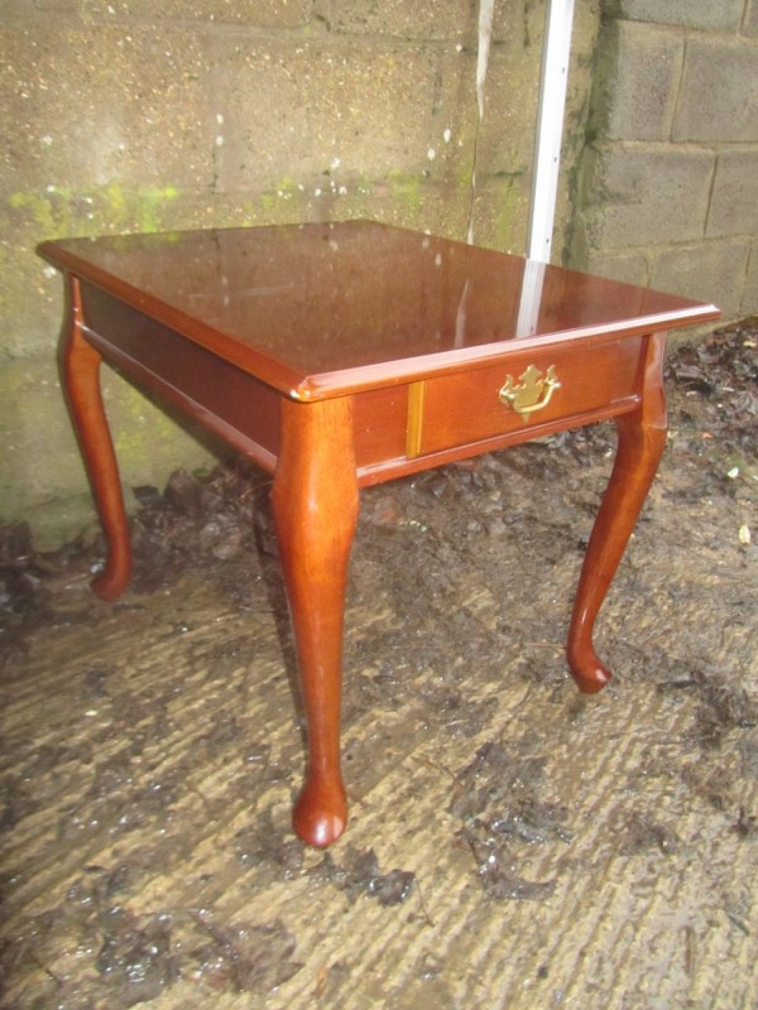 A SMALL COFFEE TABLE IN THE QUEEN ANNE STYLE, IT STANDS ON CABRIOLET LEGS. A STURDY LITTLE TABLE, SMALL DRAWER BELOW.