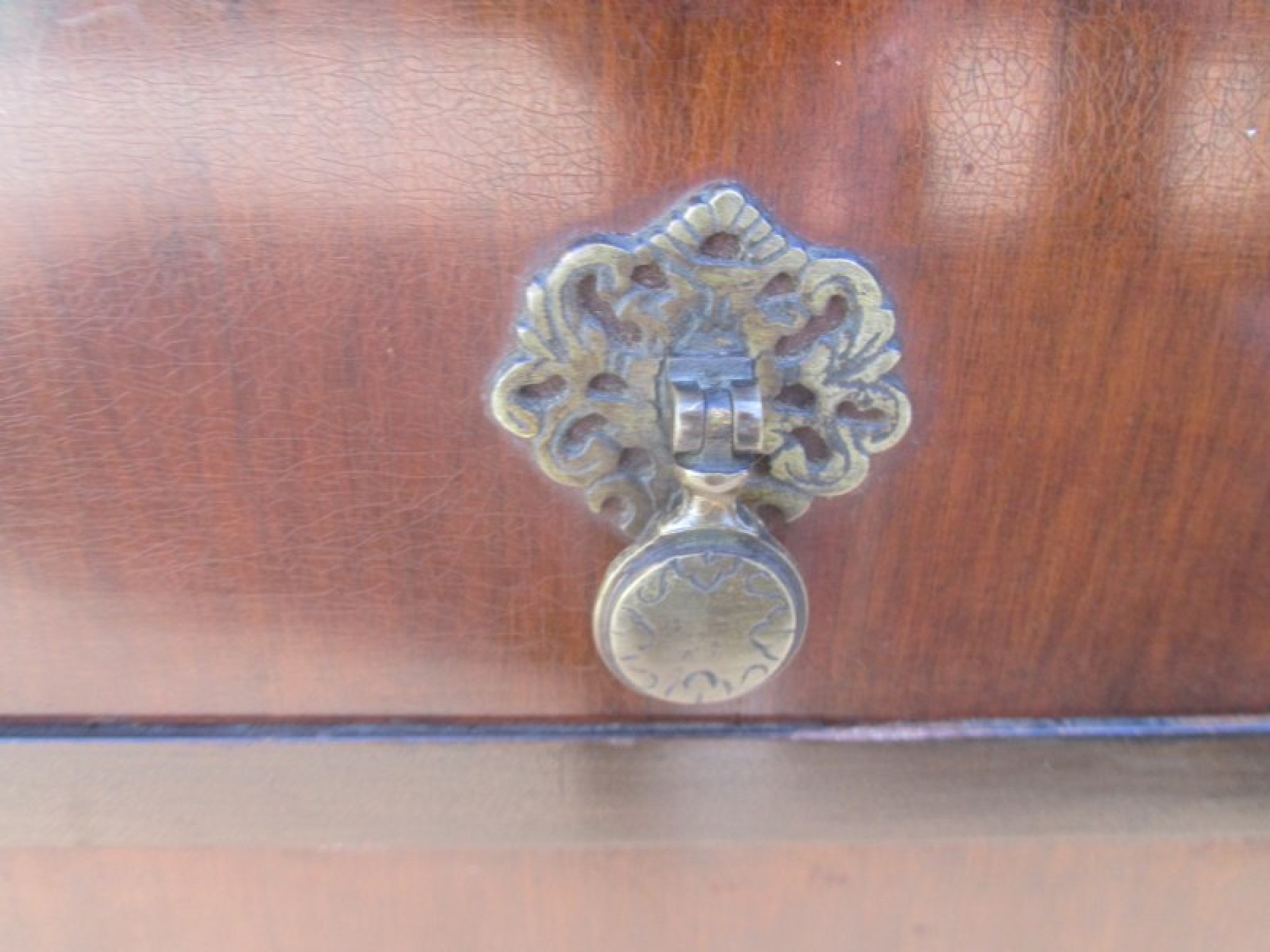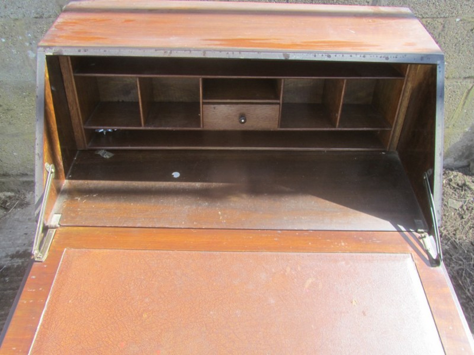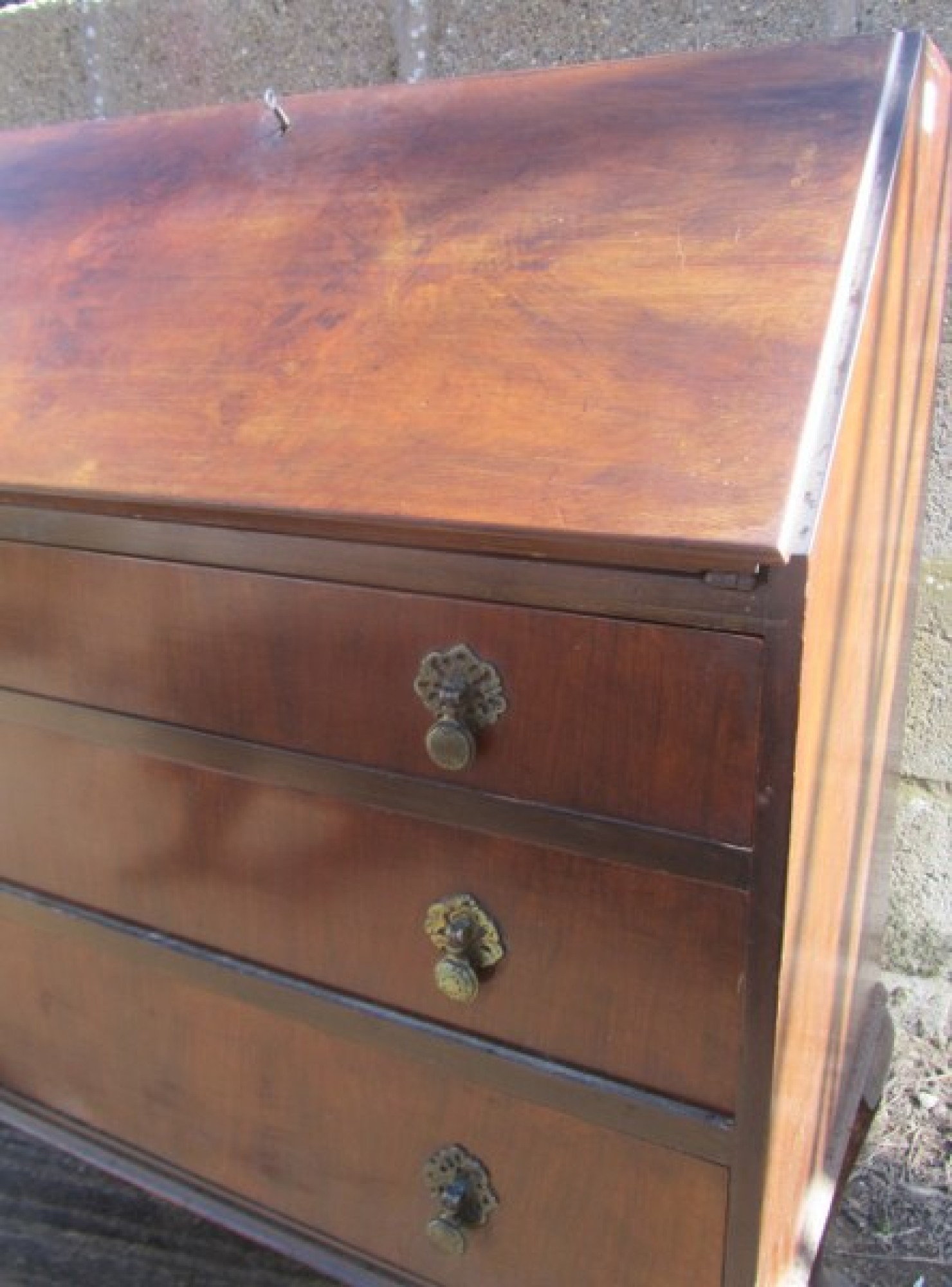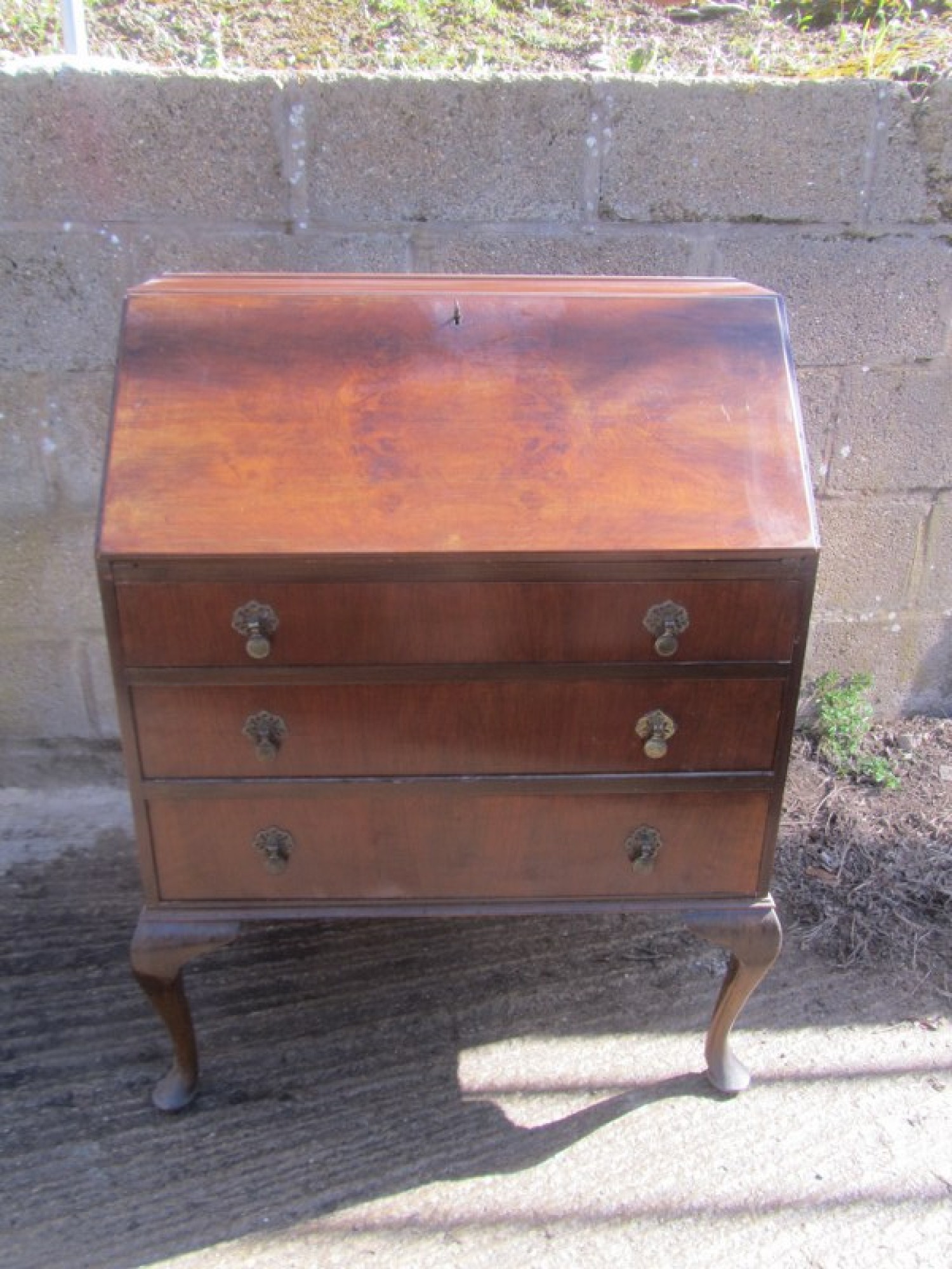 THIS IS A BUREAU FROM THE 1940s. IT IS WALNUT VENEERED, THE TOP SECTION HAS A DROP DOWN FRONT WHICH RESTS ON LOPERS, INSIDE THE BUREAU IT IS FITTED WITH PIGEON HOLES. BELOW THERE ARE DRAWERS WITH METAL HANDLES.