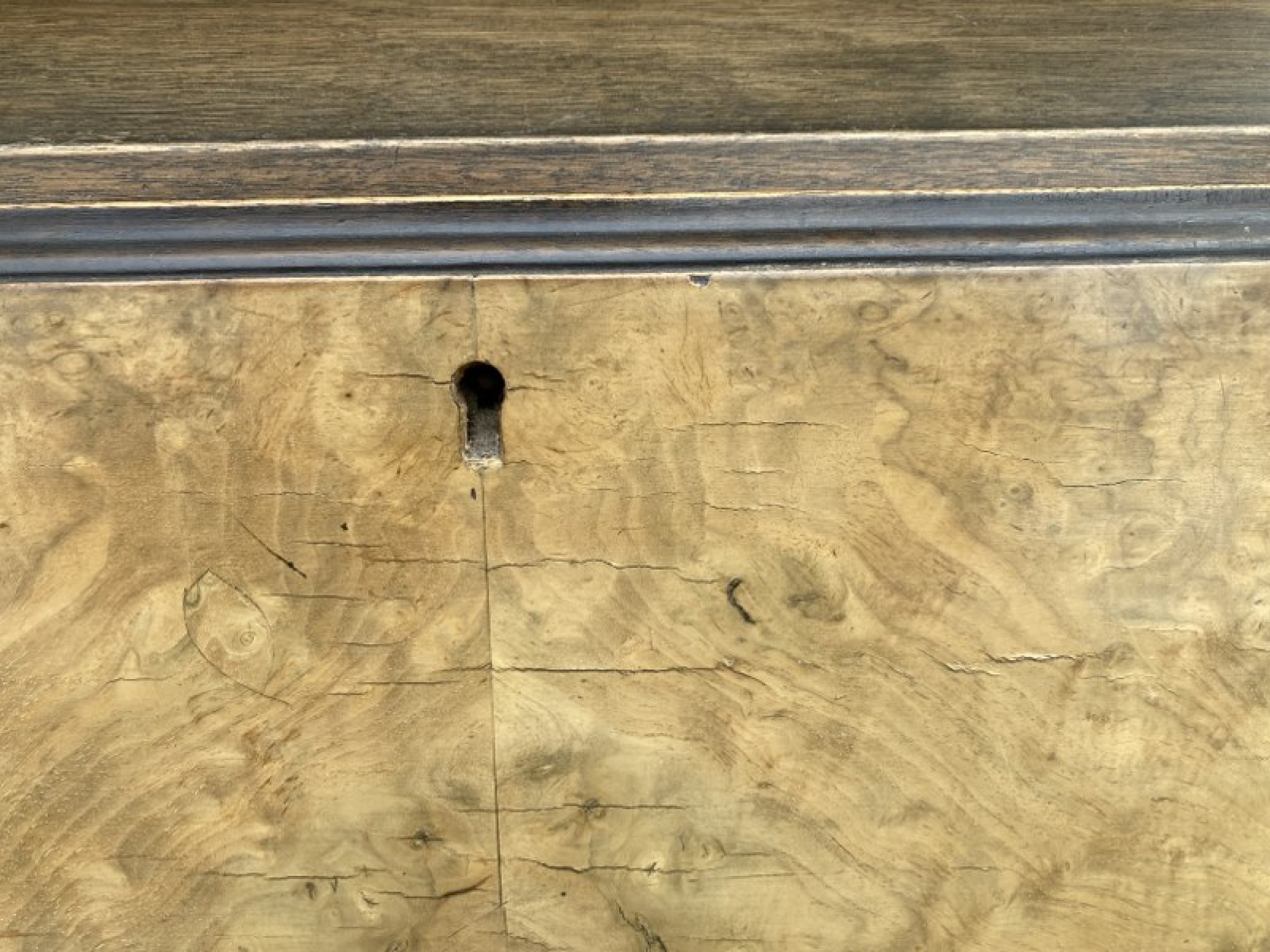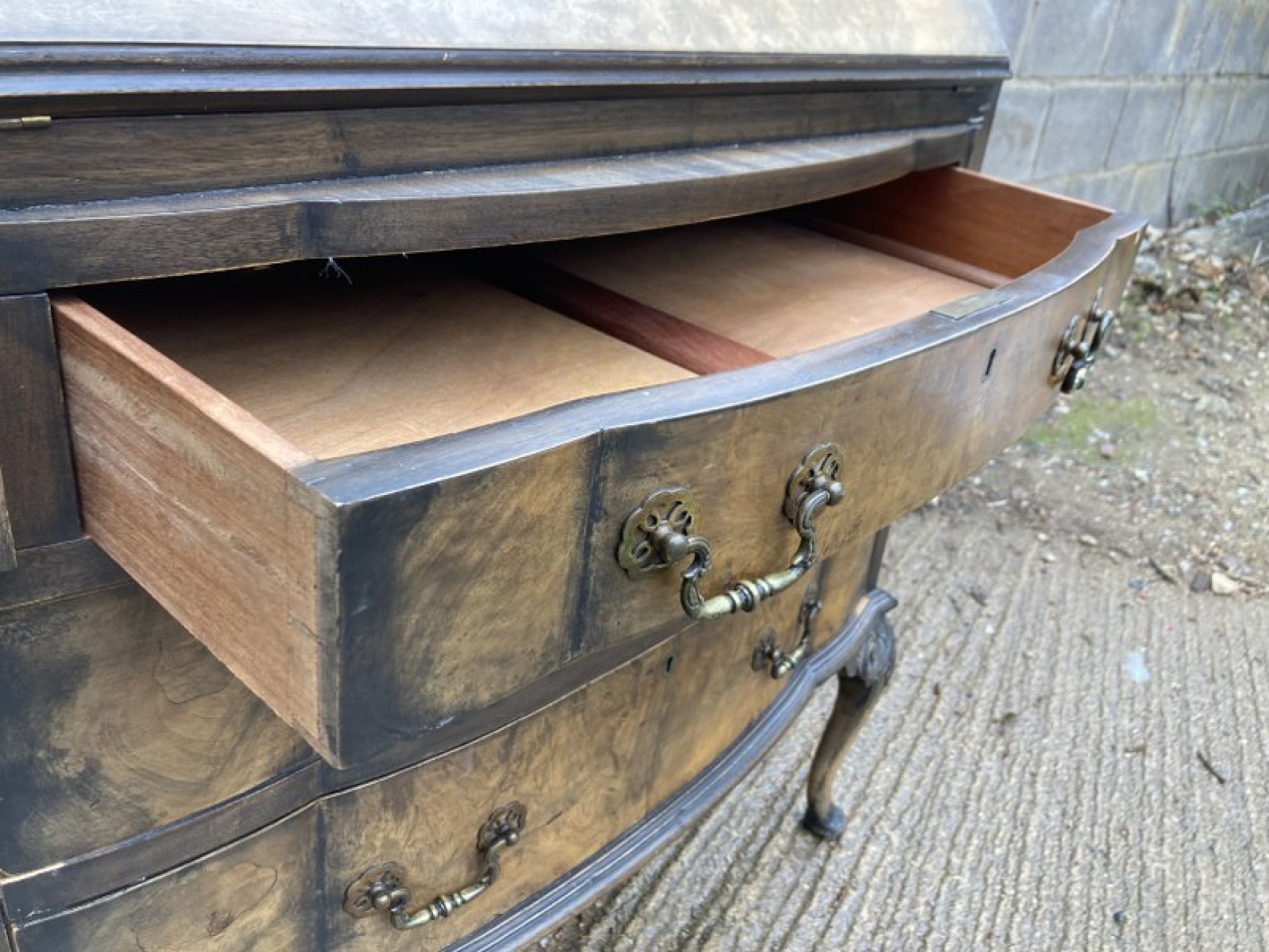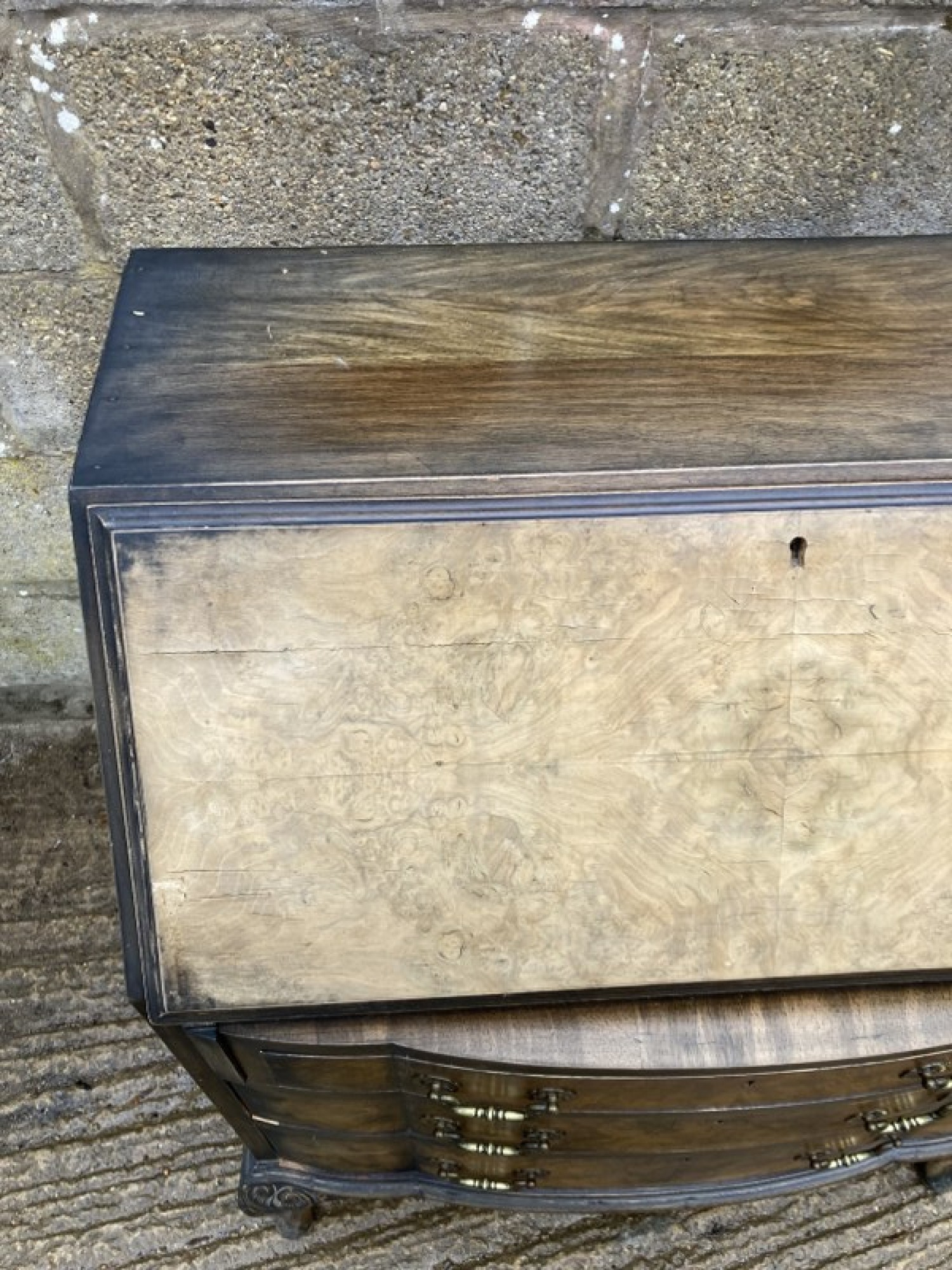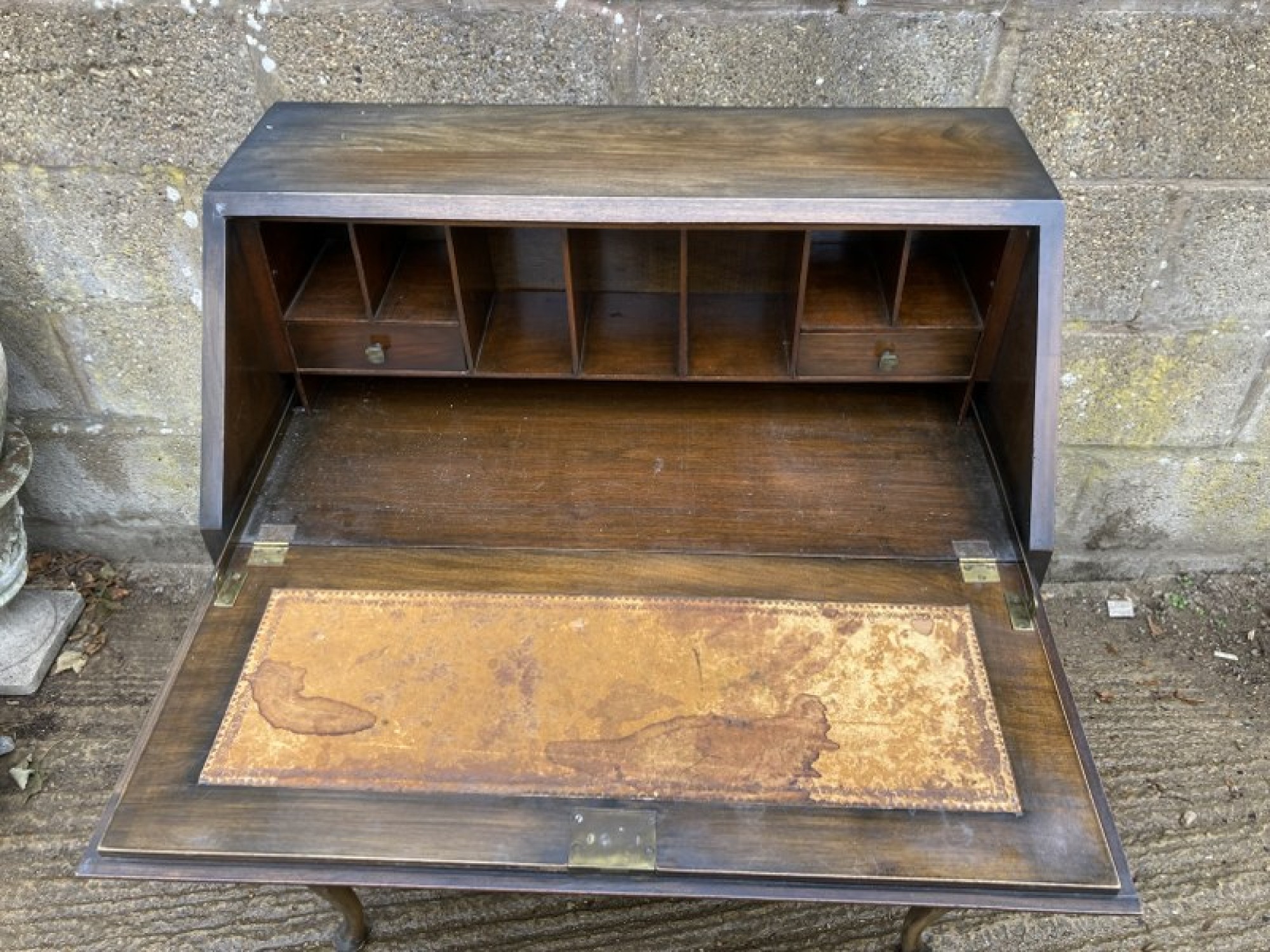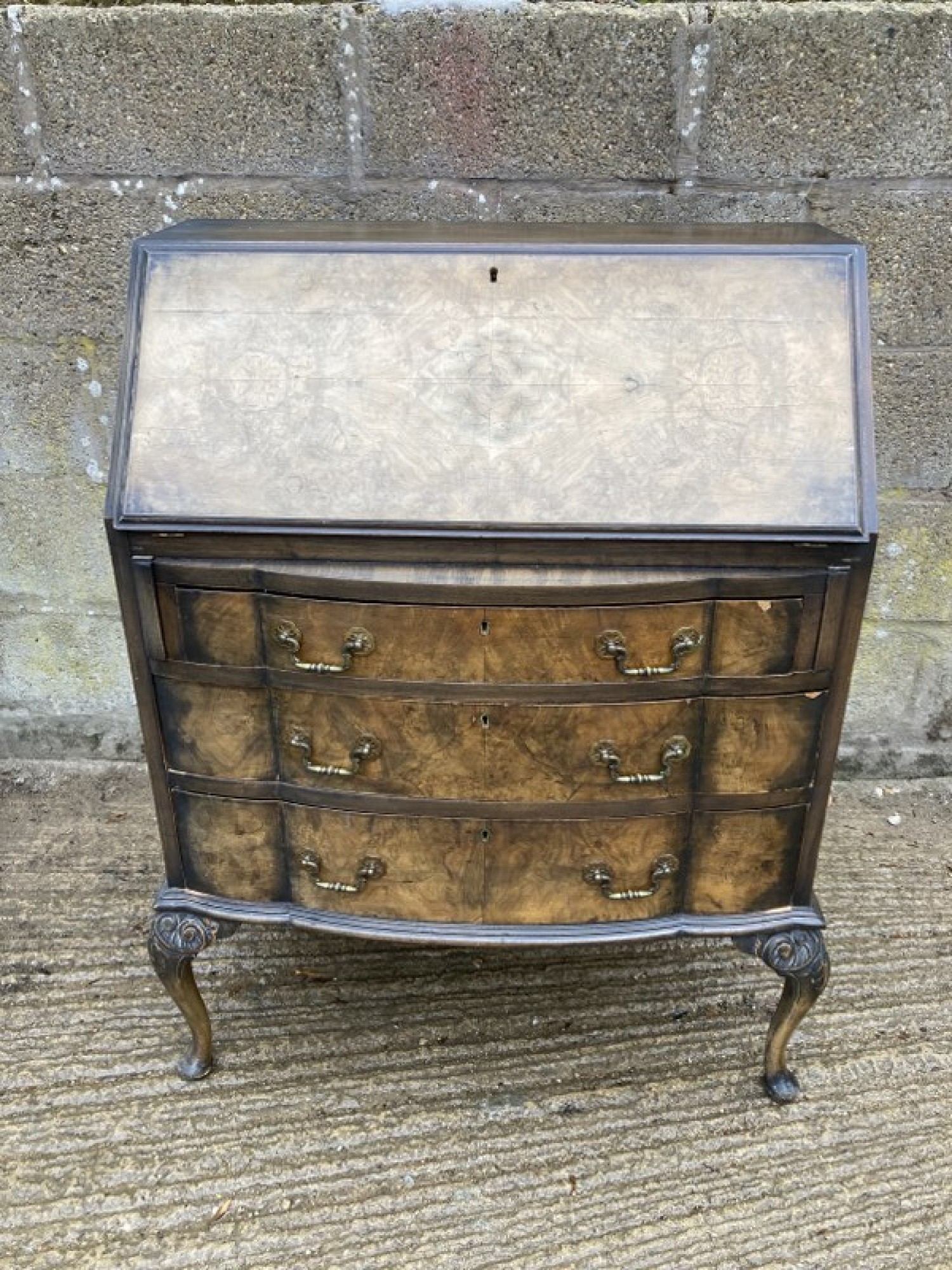 IT IS AN OLD BUREAU ON CABRIOLET LEGS. OVER ALL IT IS IN AVERAGE CONDITION WITH WEAR AND TEAR. SOME VENEER DAMAGE, FADED etc. ITS AN ATTRACTIVE AND USEFUL PIECE, IN NEED OF RESTORATION.