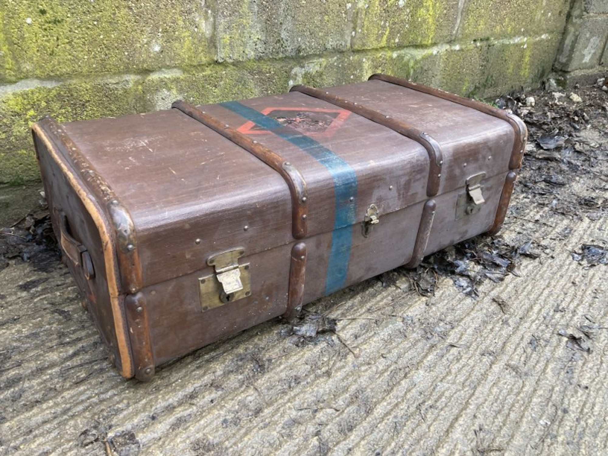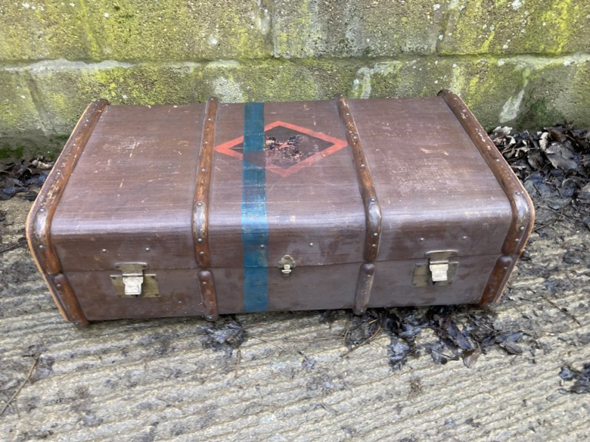 THIS IS A VINTAGE STEAMER TRUNK FROM THE 1920s/30s. THE LOCKS ARE WORN, WITH WOODEN BANDS AROUND THE TRUNK. IT IS NATURALLY WORN, A GREAT VINTAGE LOOK!