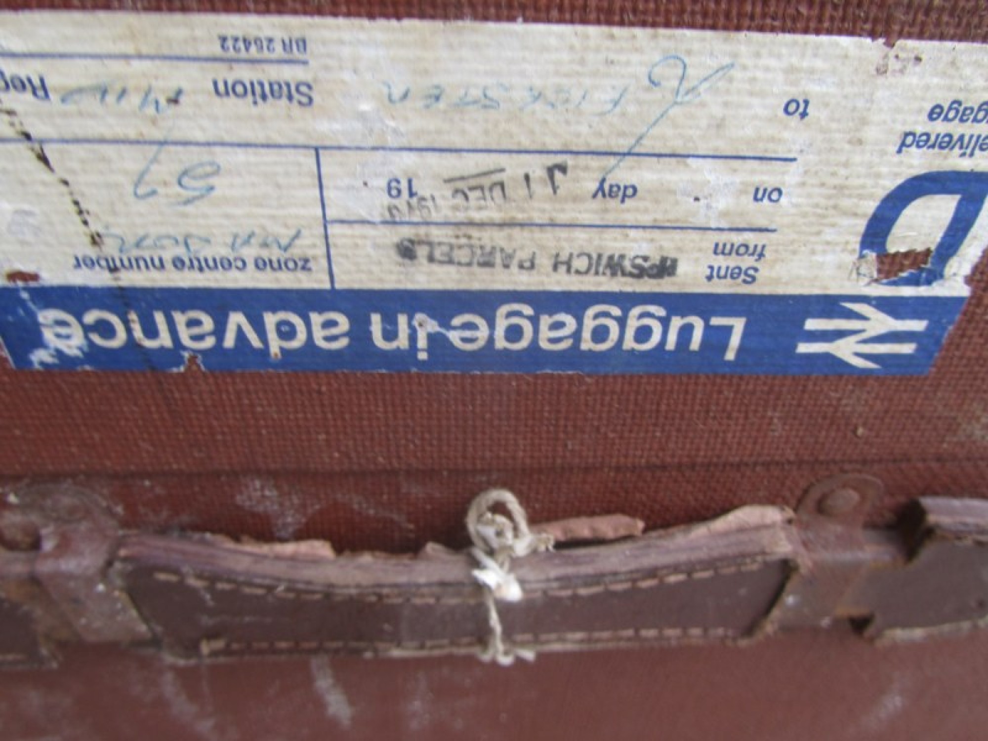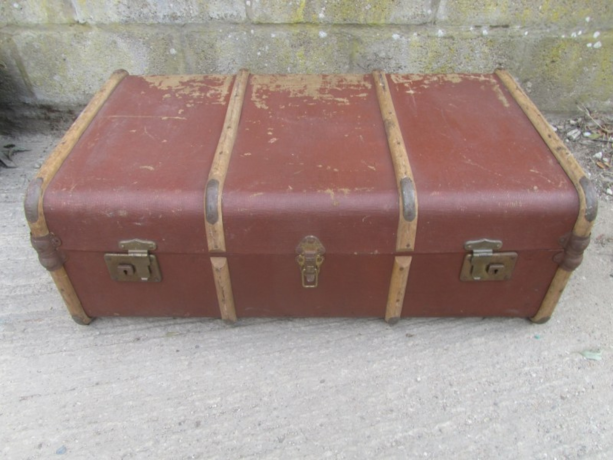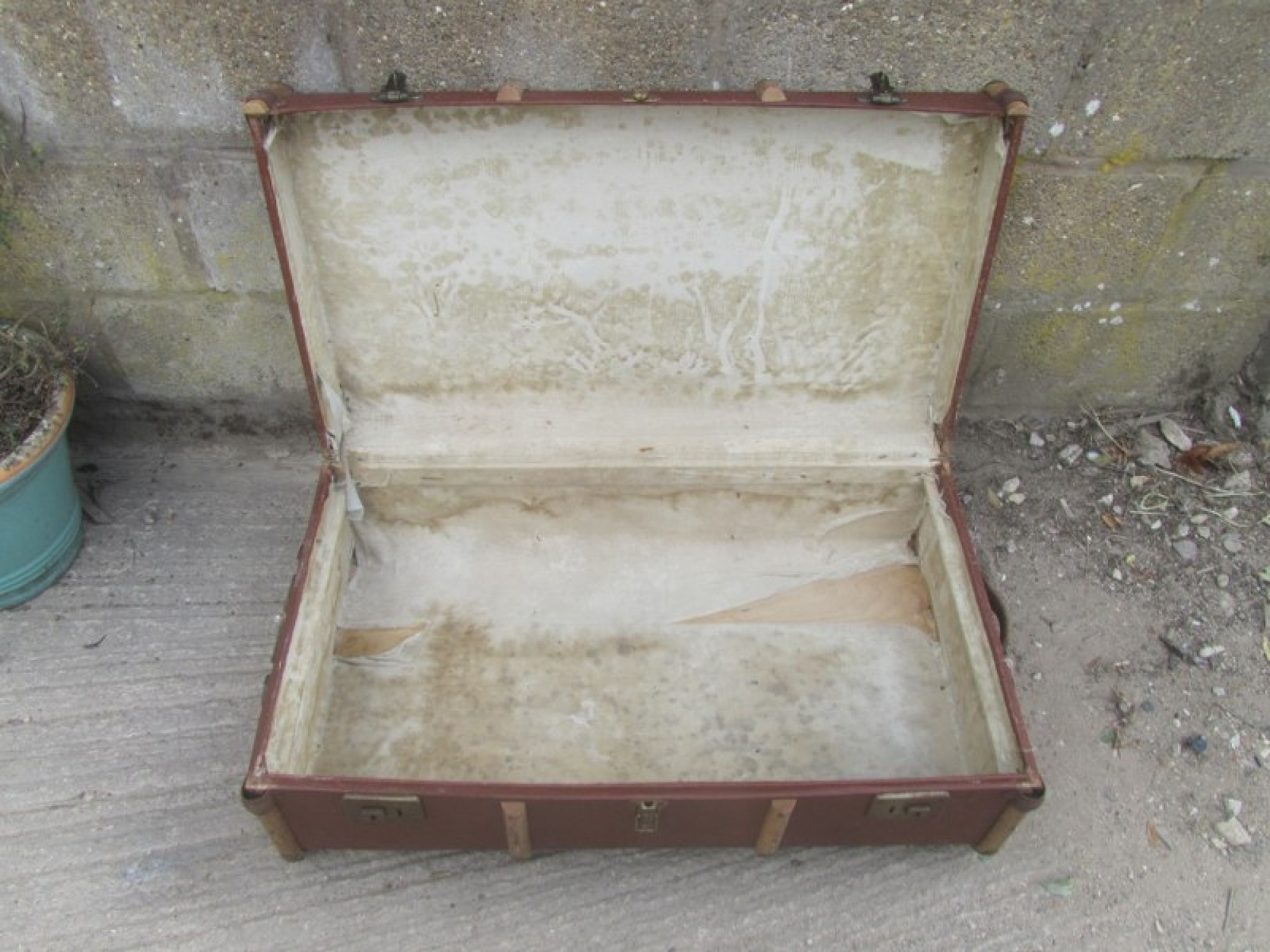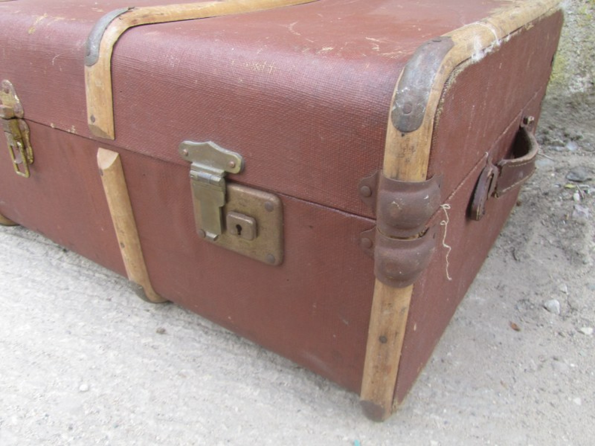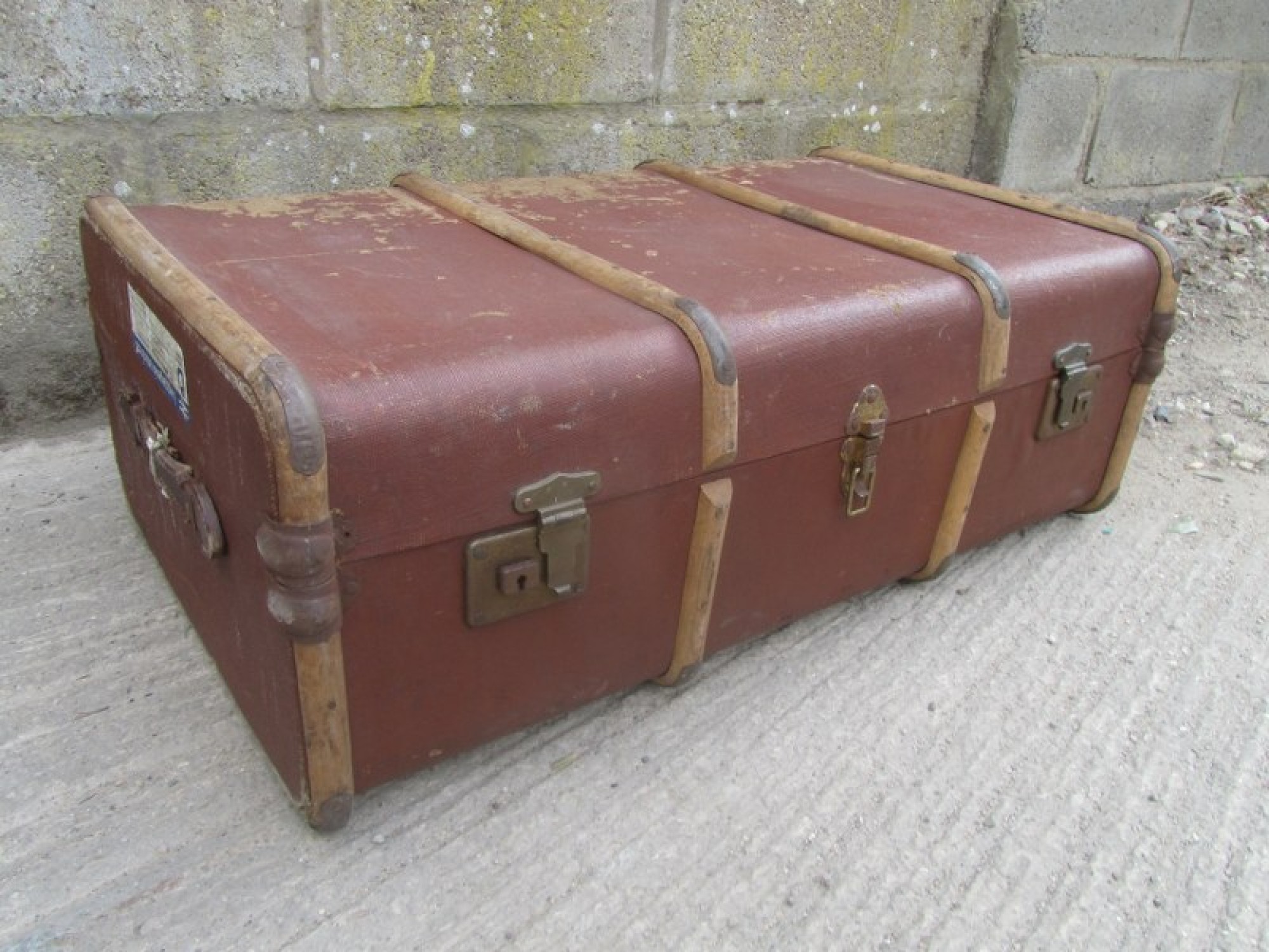THIS IS A VINTAGE STEAMER TRUNK FROM THE 1920s/30s. IT IS BROWN. THE CATCHES ARE WORN.