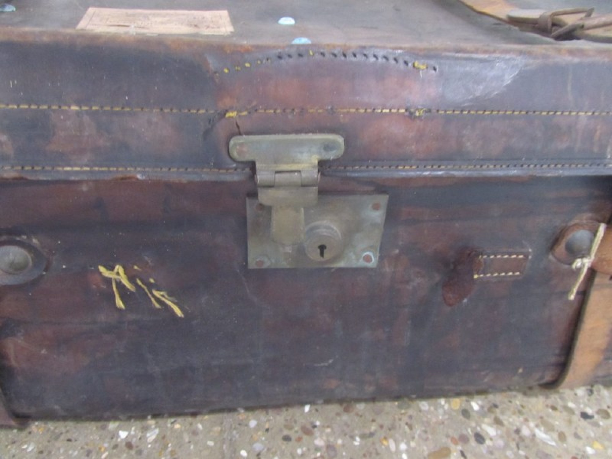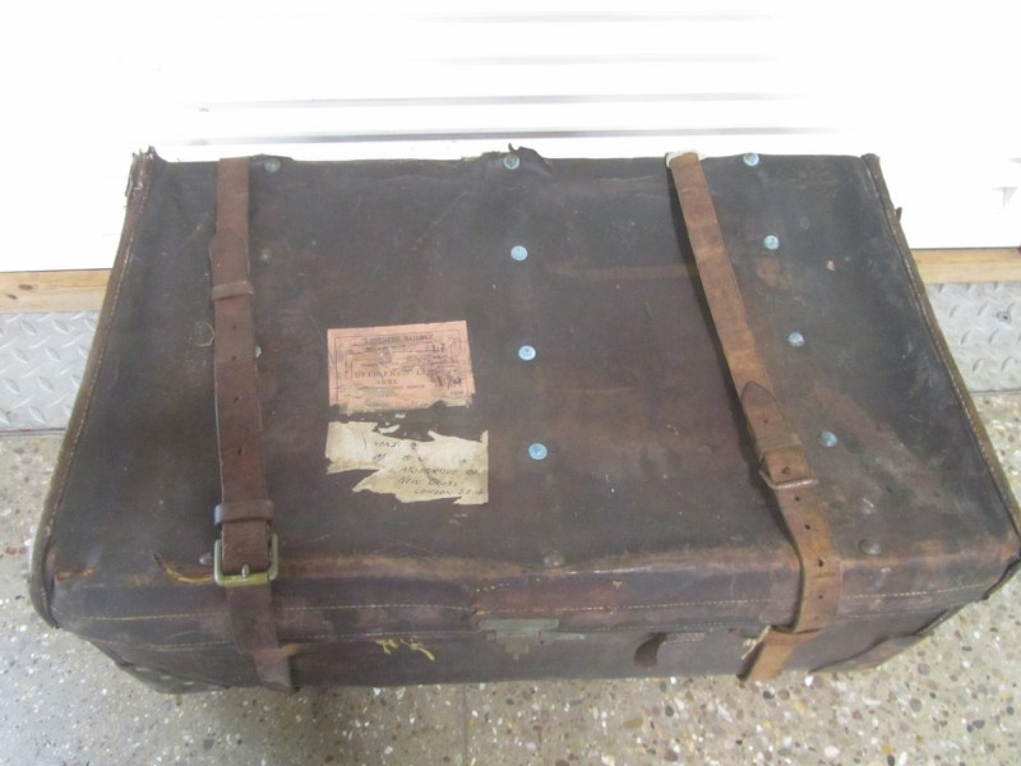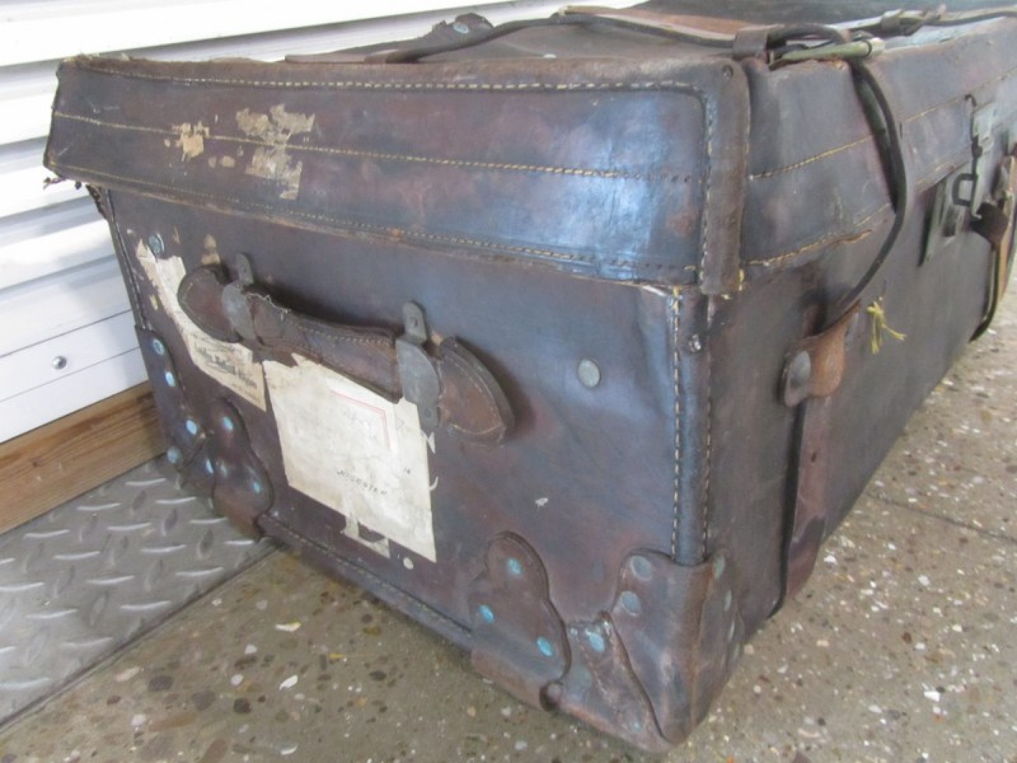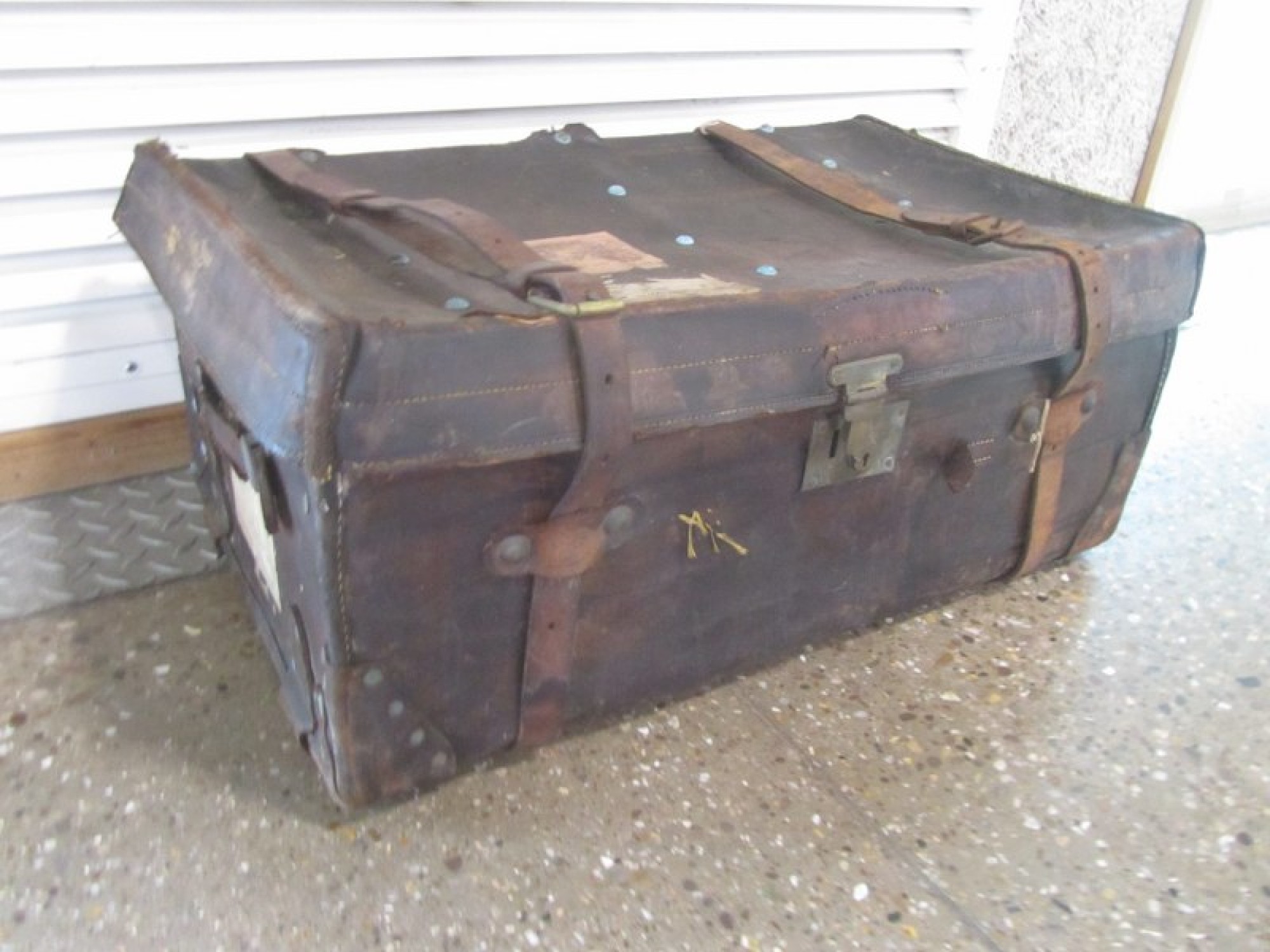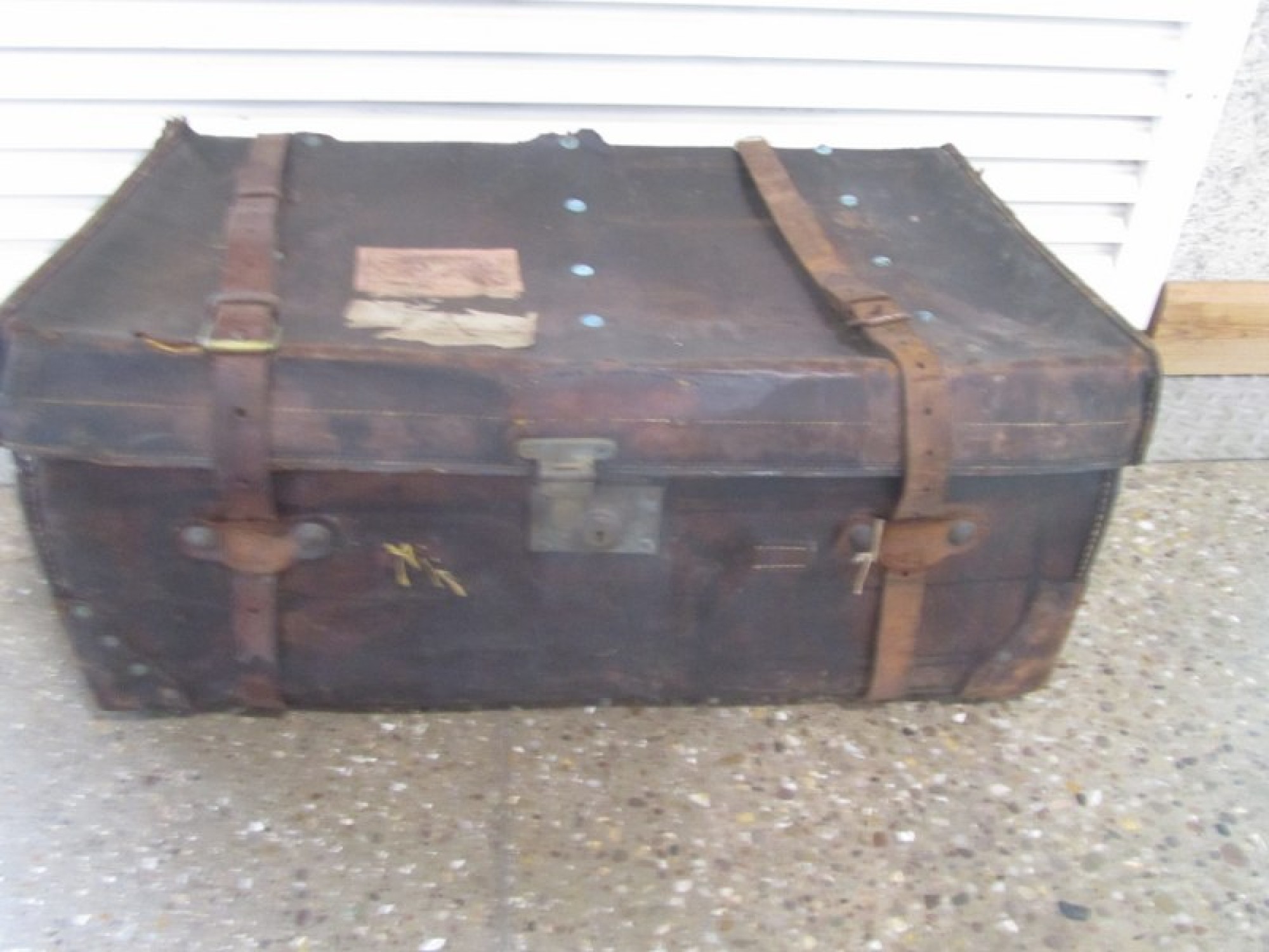 A GREAT PIECE FOR ANYWHERE IN THE HOME, IDEAL FOR STORAGE etc. IT IS IN WORN CONDITION, ITS SCUFFED AND KNOCKED AROUND. IT IS WORN, BUT STILL A CHARMING TRUNK. IDEAL FOR THE VINTAGE HOME. MUSTY AND STAINED INSIDE.