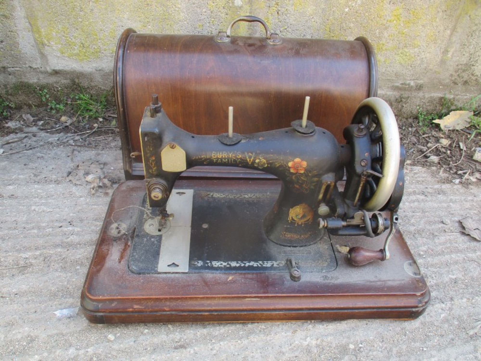 A DECORATIVE SEWING MACHINE. THE MACHINE IS METAL AND IS FITTED TO A WOODEN BASE, INCLUDES WOODEN CASE. IT IS SOLD FOR DECORATIVE USE ONLY, ALTHOUGH THE HANDLE TURNS AND IT POSSIBLY WORKS, BUT PROBABLY NOT TO A GOOD STANDARD. SIZES ARE INCLUDING THE CASE. WORN AND SCUFFED.