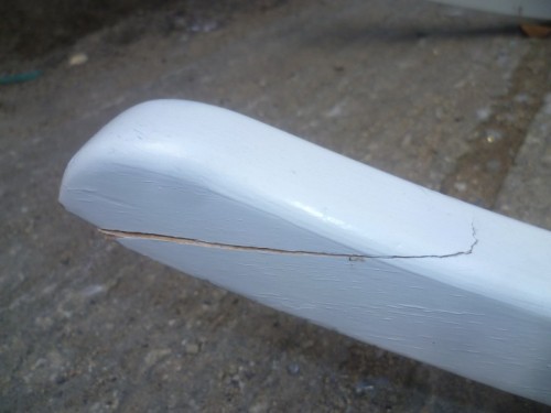 THE ARMREST HAS BROKEN IN THE JOINT AND THE REAR TIP ON ONE ROCKER HAS BEEN REPAIRED.