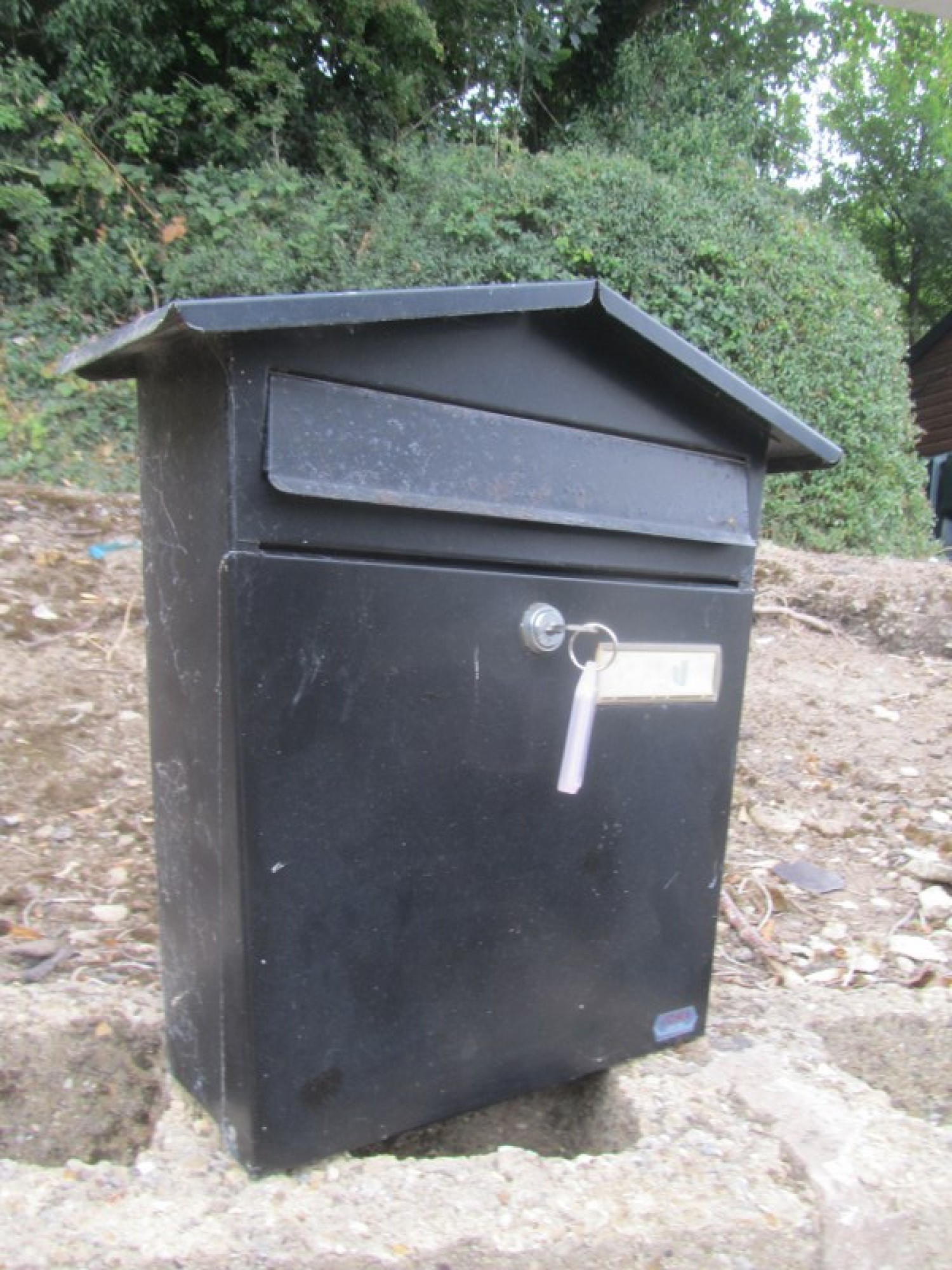 A WALL MOUNTED METAL POST / LETTER BOX WITH KEY. SOME RUST AND WEAR.