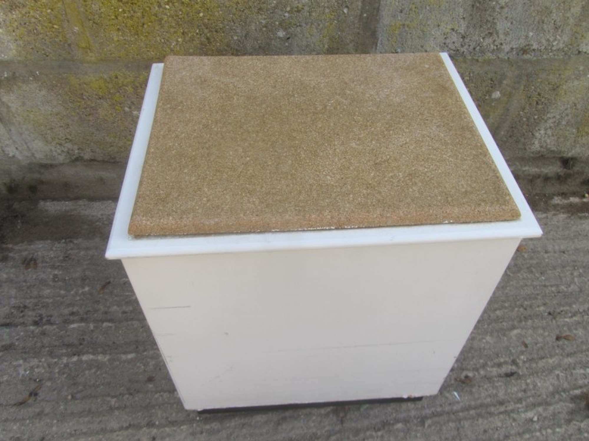 THIS IS A WHITE CHEST WITH A CORK TOP. IT LIFTS UP TO GIVE STORAGE SPACE INSIDE. AVERAGE CONDITION.