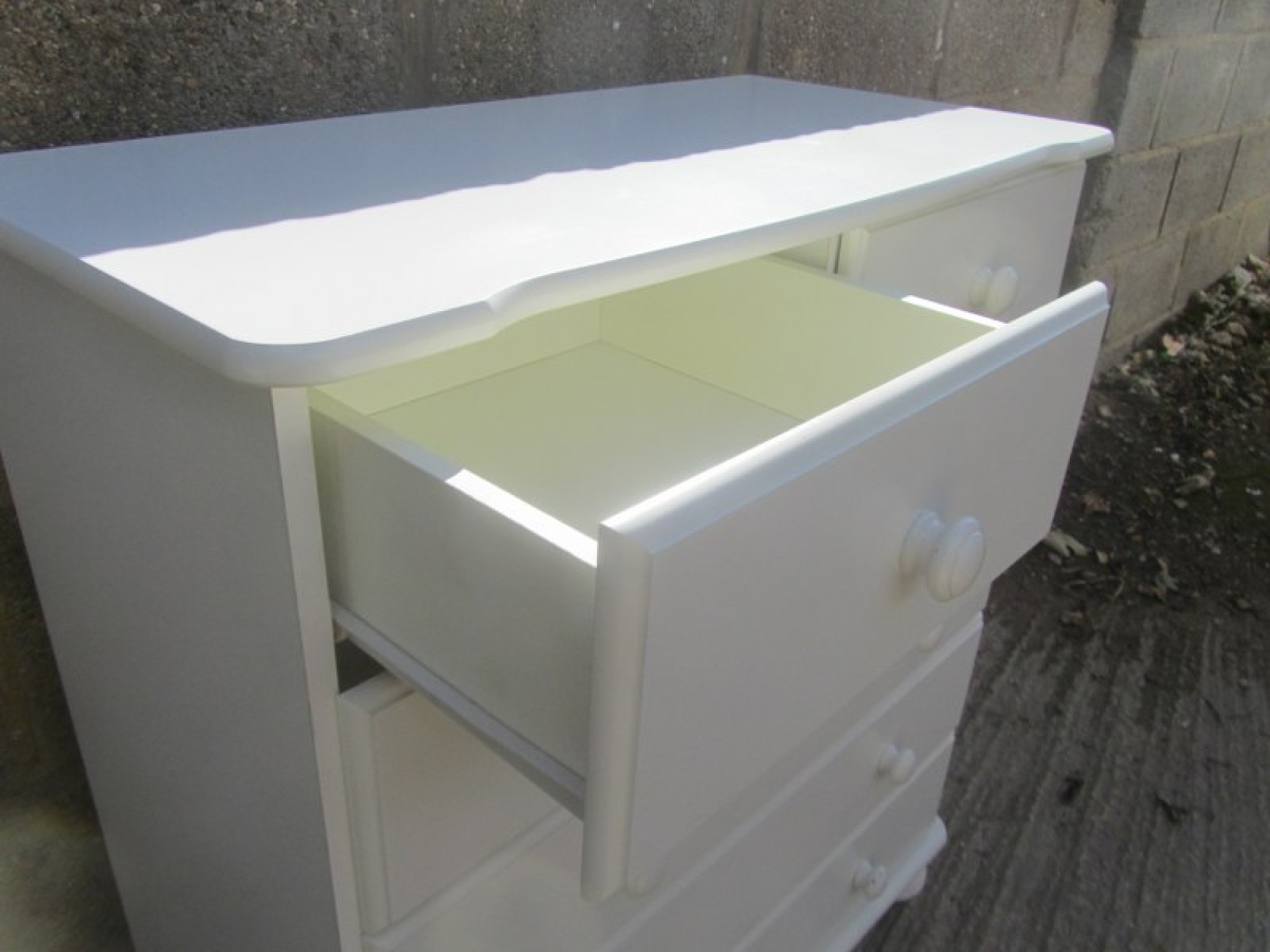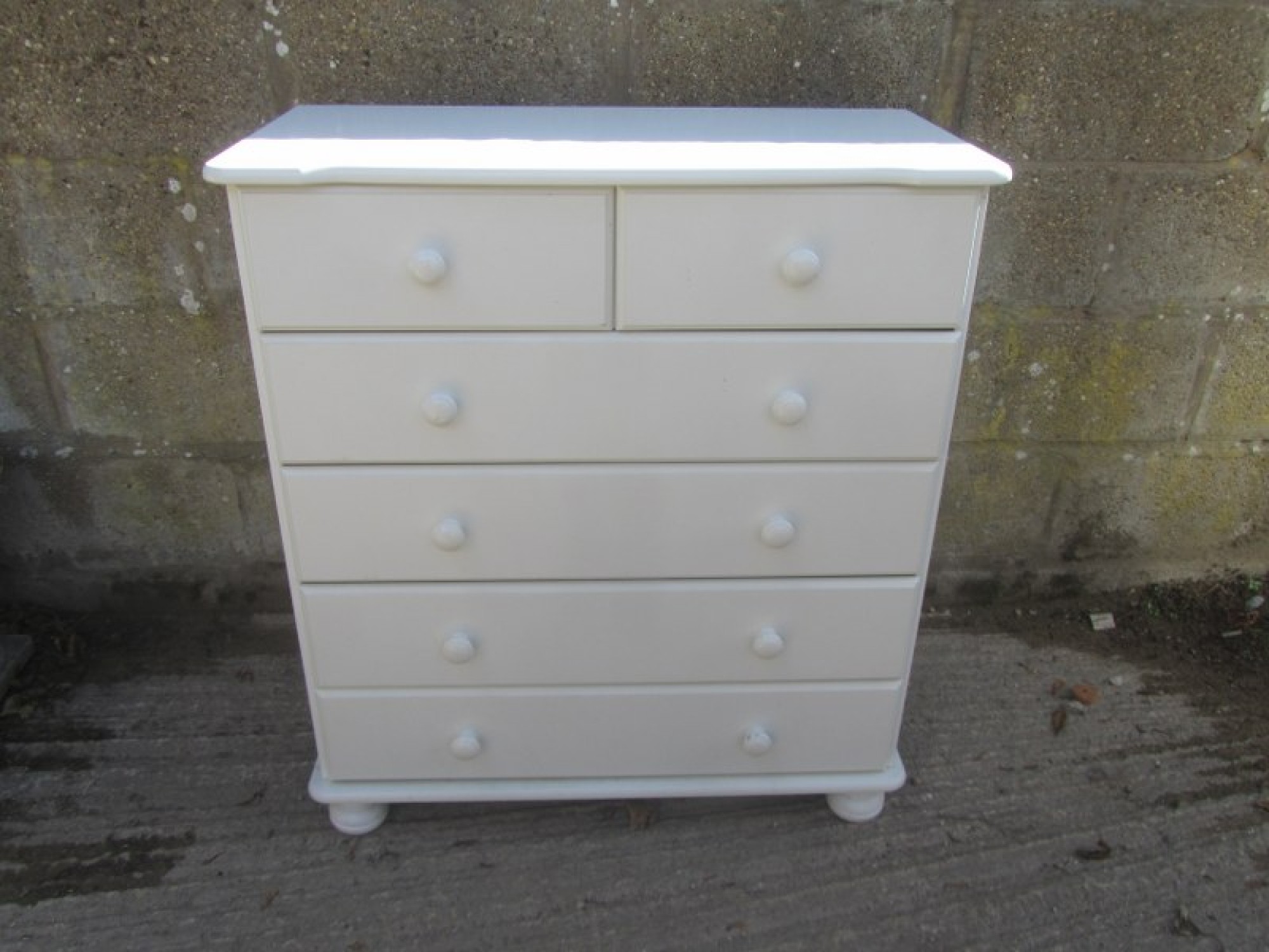 THIS IS A CHEST OF DRAWERS IN A WHITE MELAMINE FINISH. WEAR AND MARKS.