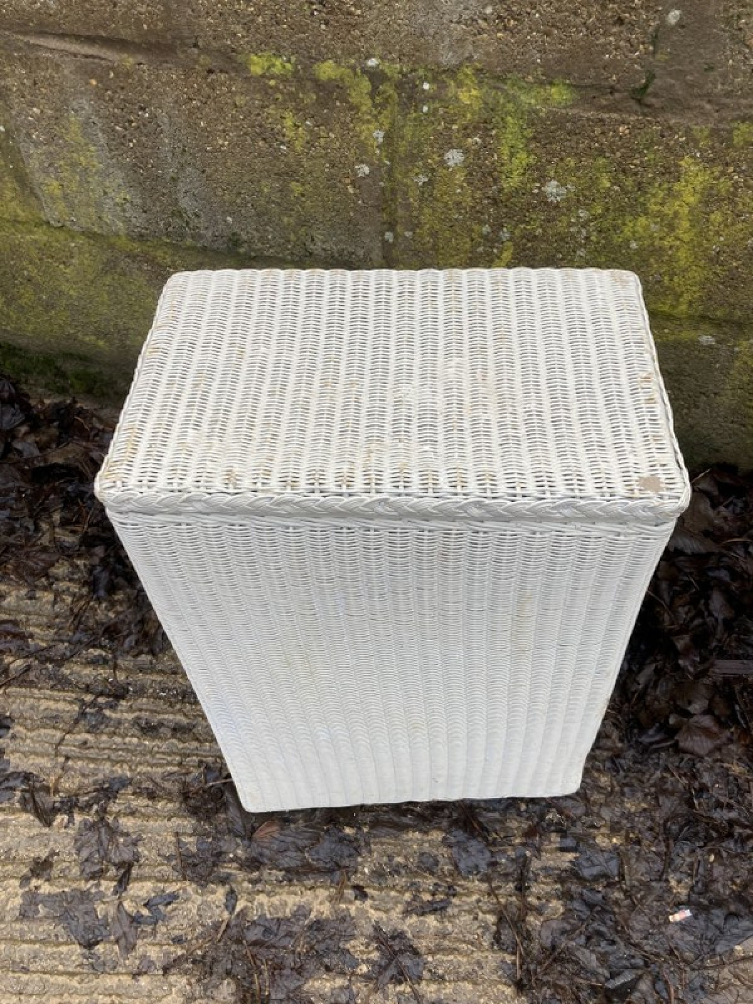 A WOVEN LLOYD LOOM WASH BIN PAINTED WHITE. THE FRAME LOOKS TO BE SLIGHTLY OUT OF SHAPE.