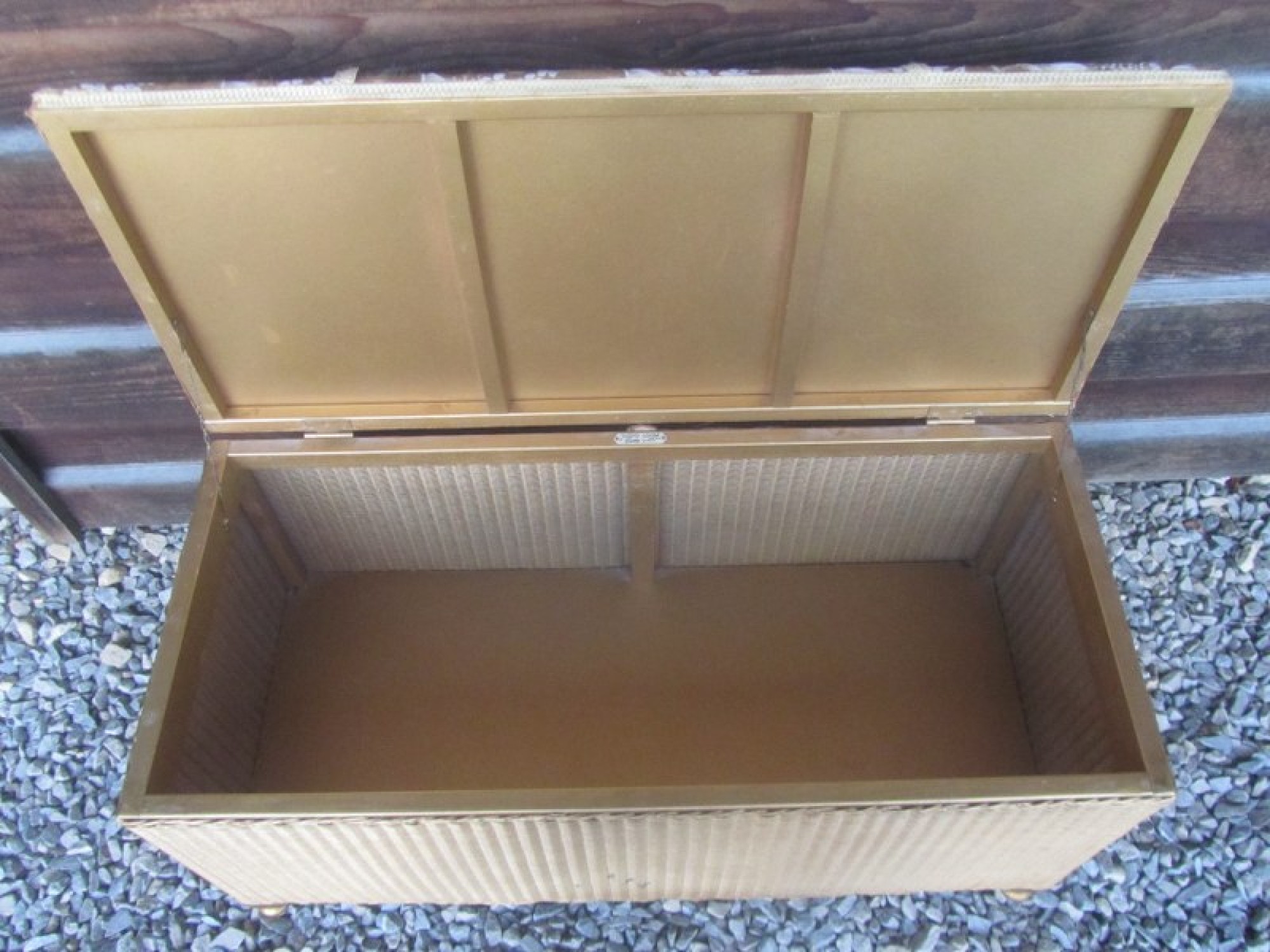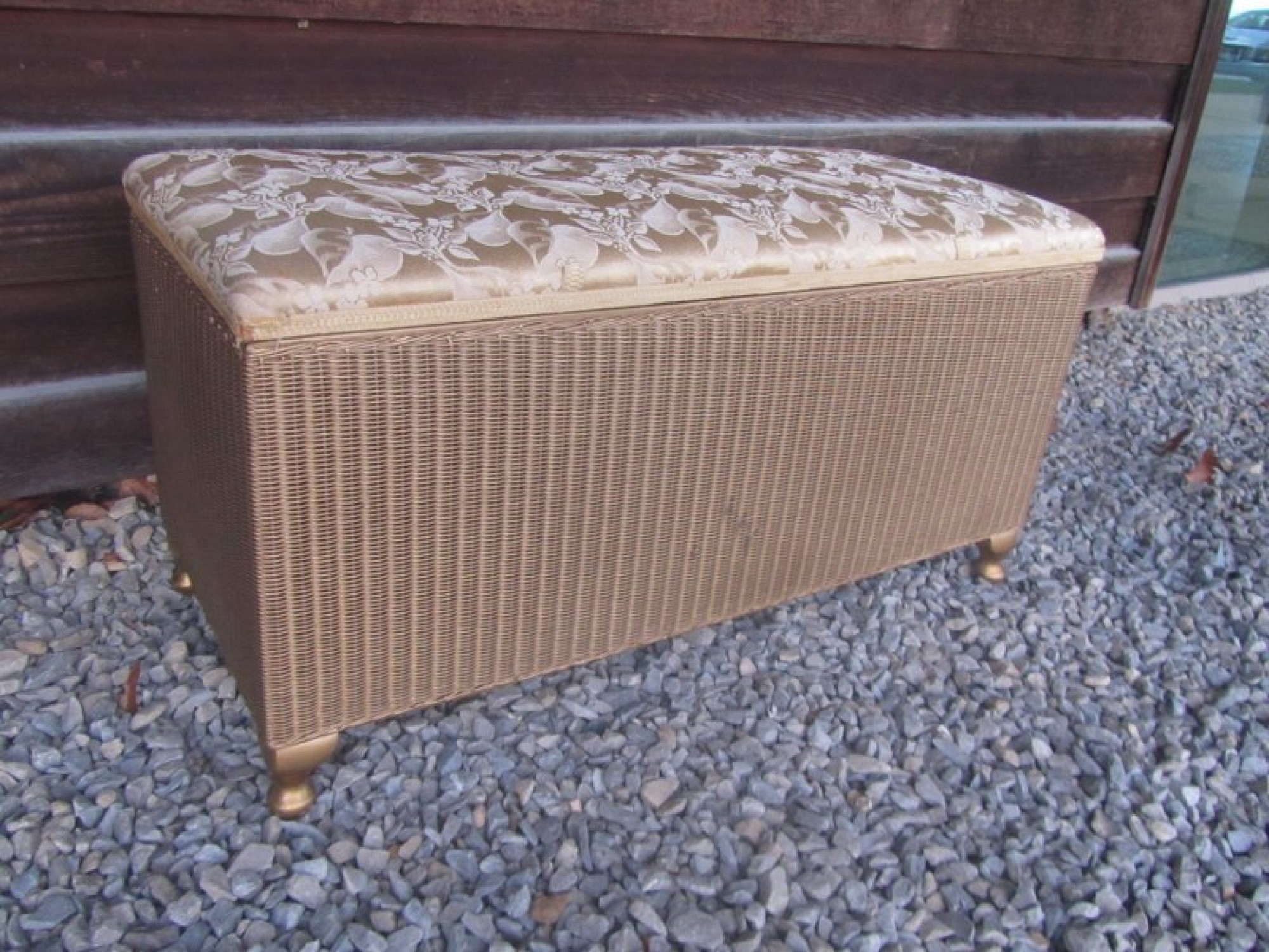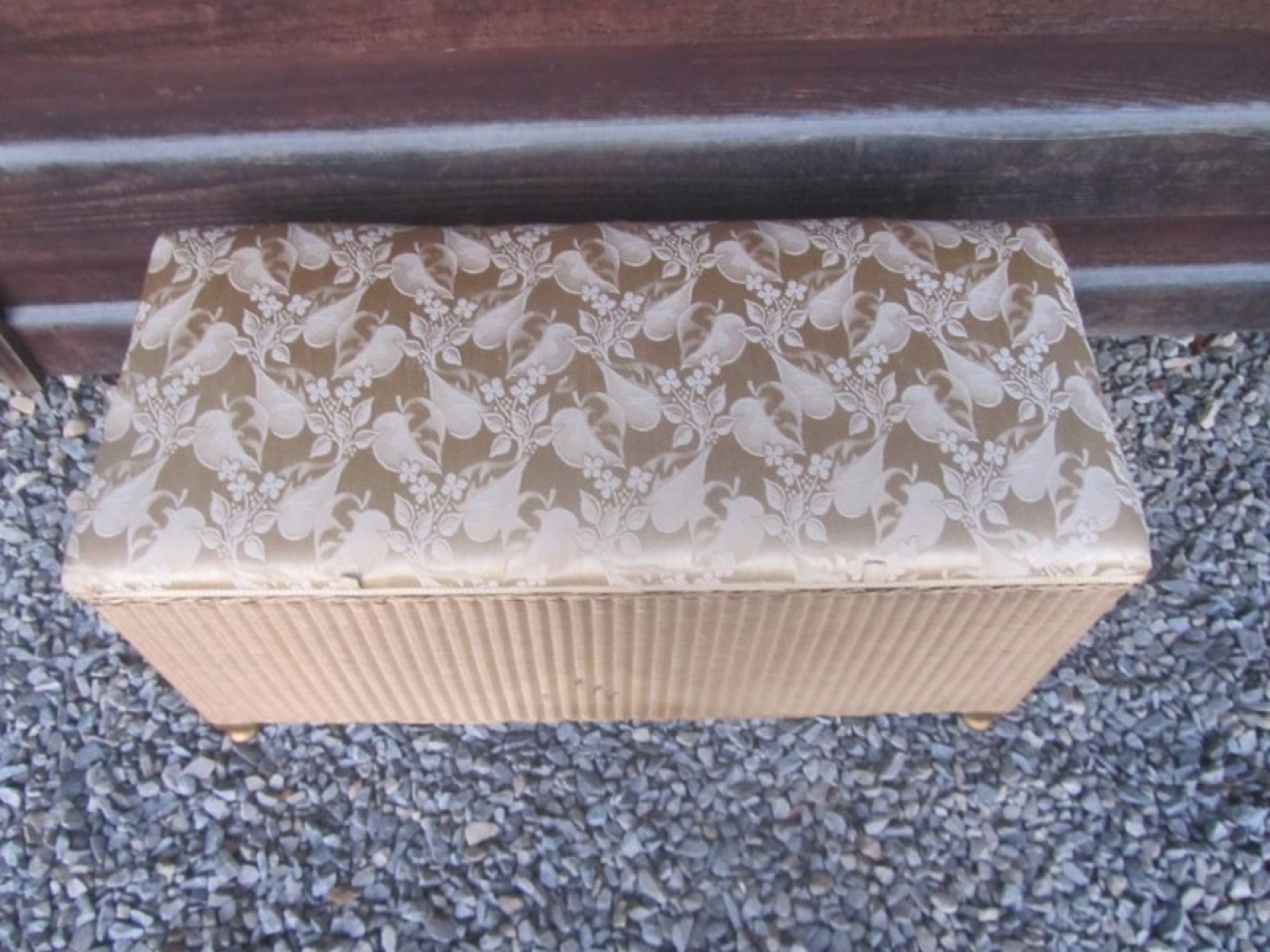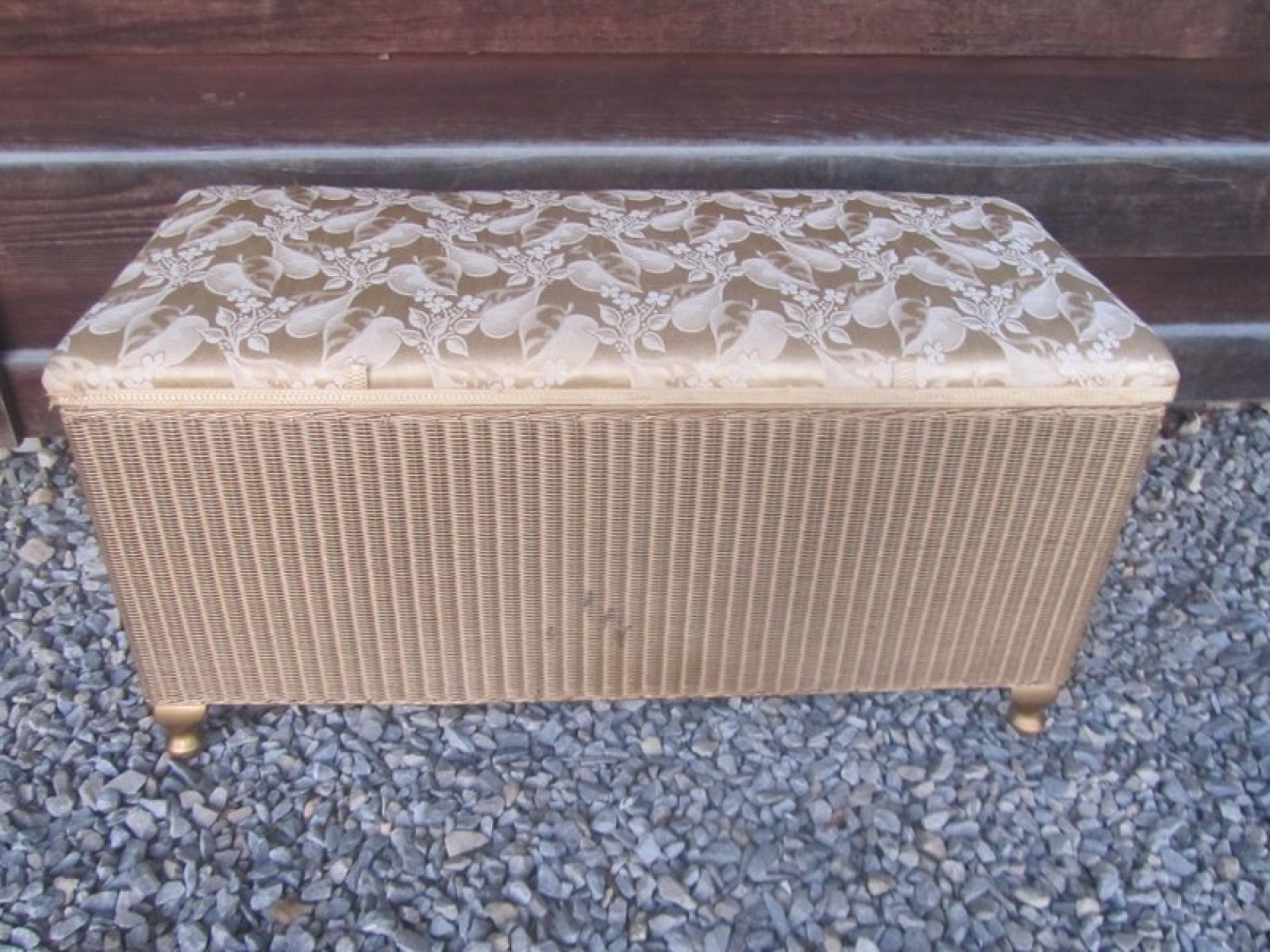 A WOVEN LLOYD LOOM OTTOMAN. THE TOP IS COVERED IN MATERIAL. ORIGINAL GOLD COLOUR.