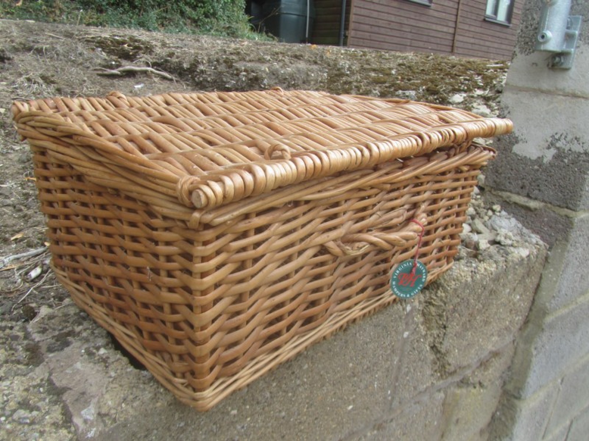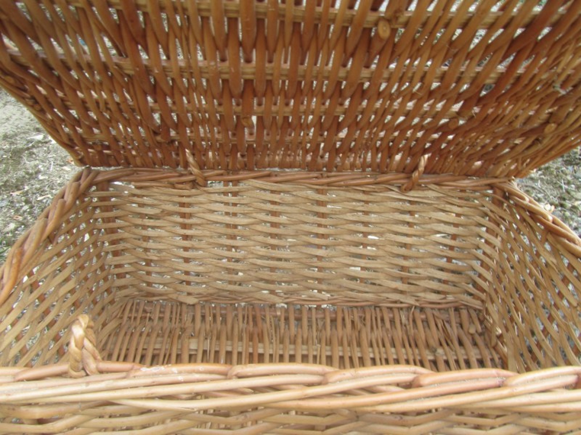 A VINTAGE STYLE WICKER PICNIC BASKET / HAMPER. LIFT UP LID, MISSING THE BAR TO KEEP THE TOP CLOSED.
